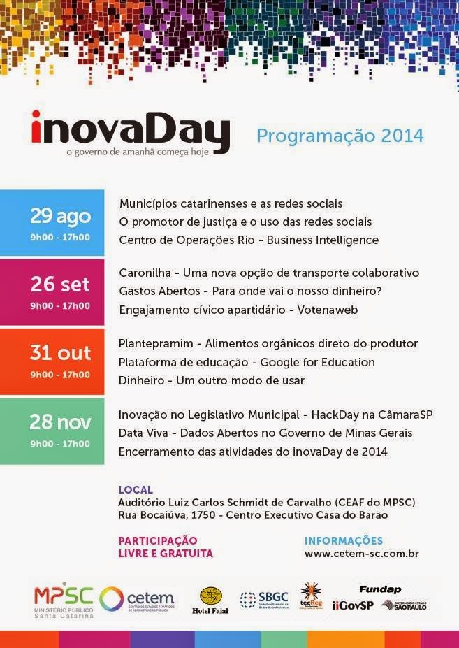 O inovaDay é um encontro mensal realizado pelo iGovSP da Secretaria de Planejamento e Desenvolvimento Regional de SP, cada evento conta com a participação de palestrantes especializados em gestão do conhecimento e inovação. Em Santa Catarina as edições acontecem desde 2013, e em 2014 serão realizadas pelo Cetem e peloMinistério Público do Estado (MPSC).