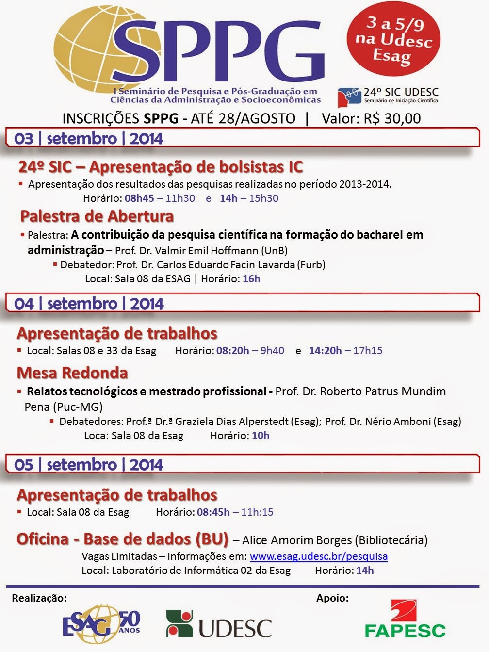 O I Seminário de Pesquisa e Pós-Graduação em Ciências da Administração e Socioeconômicas ocorrerá essa semana na UDESC/ESAG. Contará com apresentações dos bolsistas que concluíram as pesquisas em 31/07/2014, trabalhos, palestras e uma Oficina de Bases de Dados.