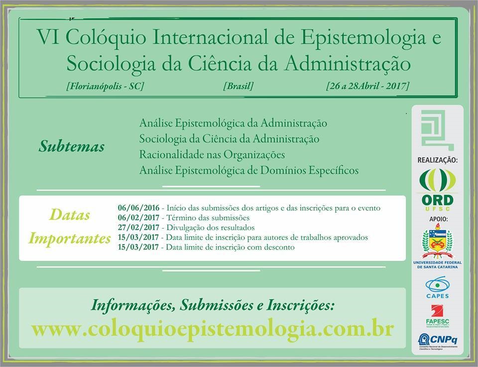 O Núcleo de Pesquisa Organizações, Racionalidade e Desenvolvimento – ORD da UFSC, parceiro do NISP, organiza a cada 2 anos o Colóquio Internacional de Epistemologia e Sociologia da Ciência da Administração. A próxima edição do evento ocorrerá nos dias 26, 27 e 28 de abril de 2017, na própria UFSC, em Florianópolis.