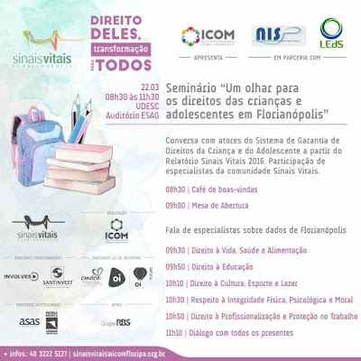 Como uma das atividades de lançamento do Relatório Sinais Vitais 2016, será realizado o Seminário “Um olhar para os direitos das crianças e adolescentes em Florianópolis” na quarta-feira, 22/03/17, das 8h30min às 12h, no auditório da ESAG/UDESC.