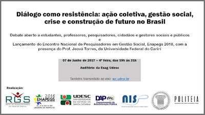 O NISP juntamente com os demais grupos de pesquisa da ESAG/UDESC  convidam a comunidade acadêmica e demais interessados para participar na quarta-feira dia 07 de junho de 2017 do debate sobre o atual momento do Brasil e para o lançamento do ENANPEGS 2018, que ocorrerá no auditório da Esag/UDESC: