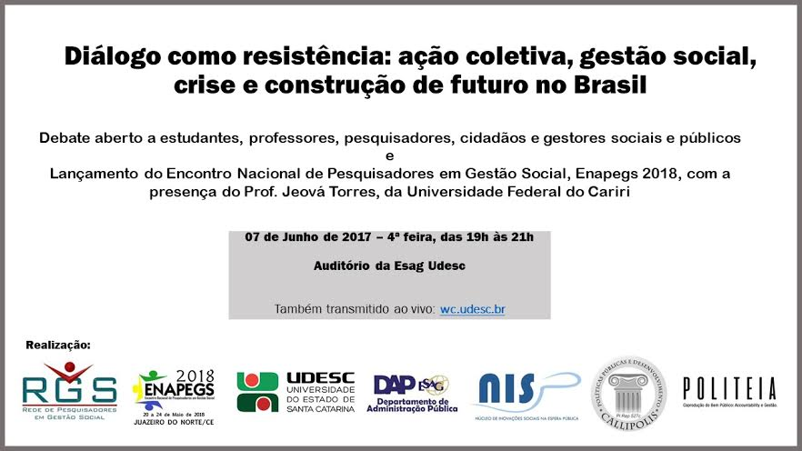 O NISP juntamente com os demais grupos de pesquisa da ESAG/UDESC  convidam a comunidade acadêmica e demais interessados para participar na quarta-feira dia 07 de junho de 2017 do debate sobre o atual momento do Brasil e para o lançamento do ENANPEGS 2018, que ocorrerá no auditório da Esag/UDESC: